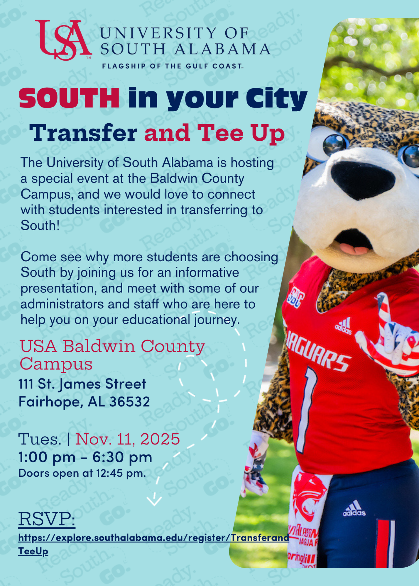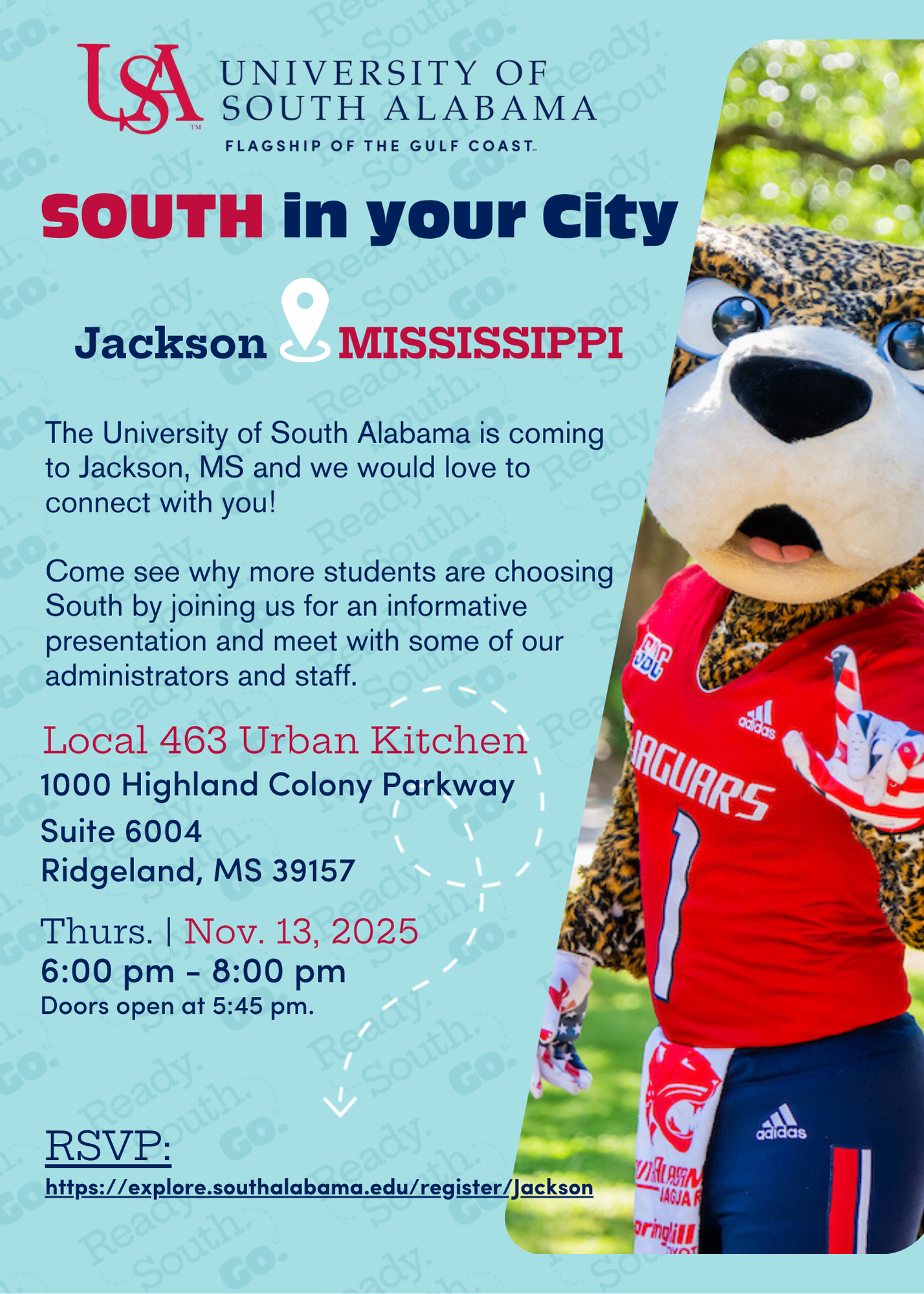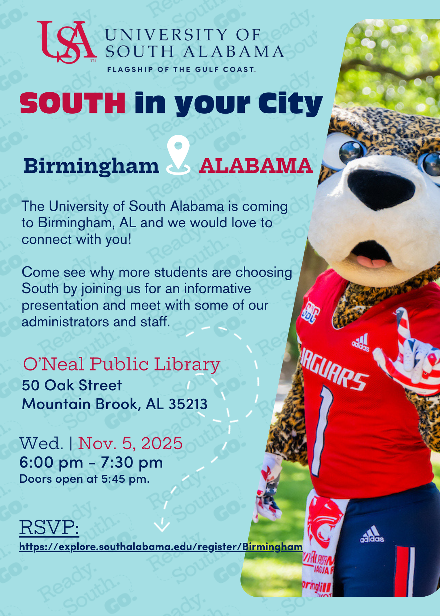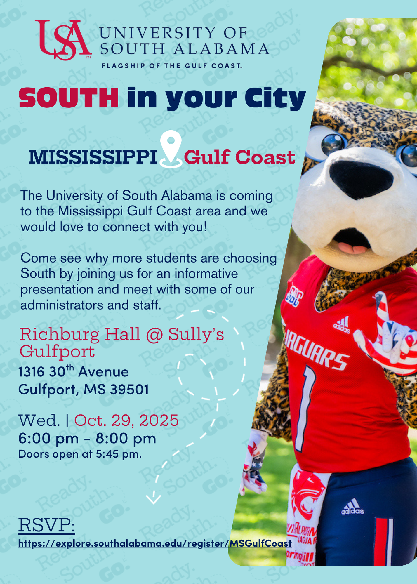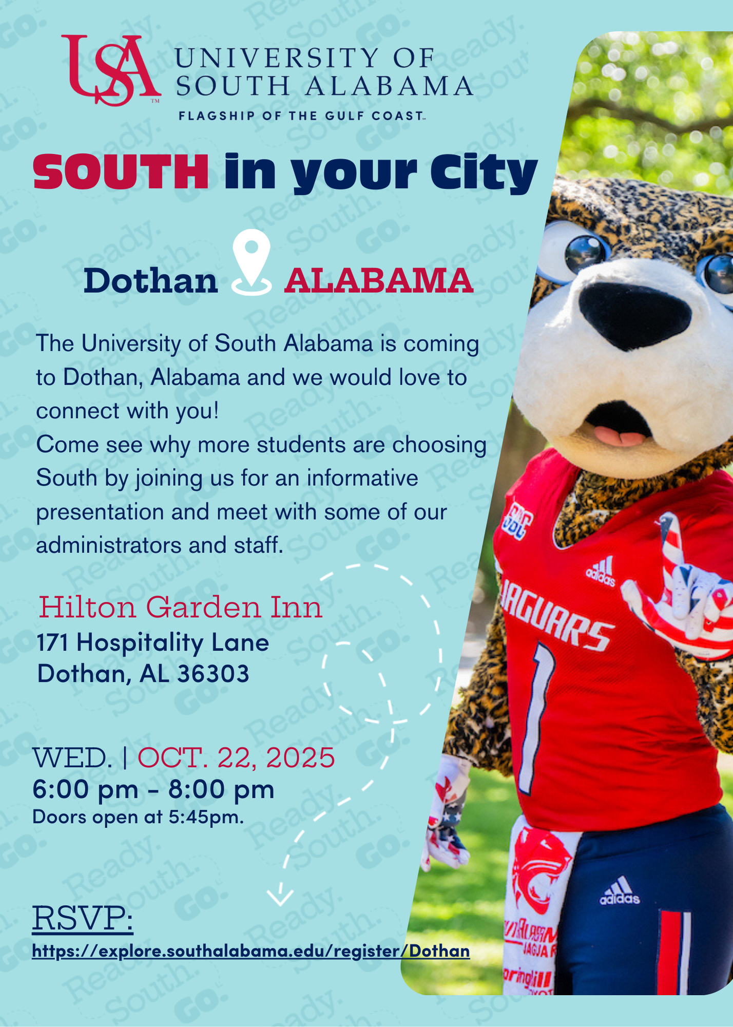 You are cordially invited to South in Your City - a University of South Alabama information event being held to help students and families learn why South is rapidly becoming one of the top choice schools for students.